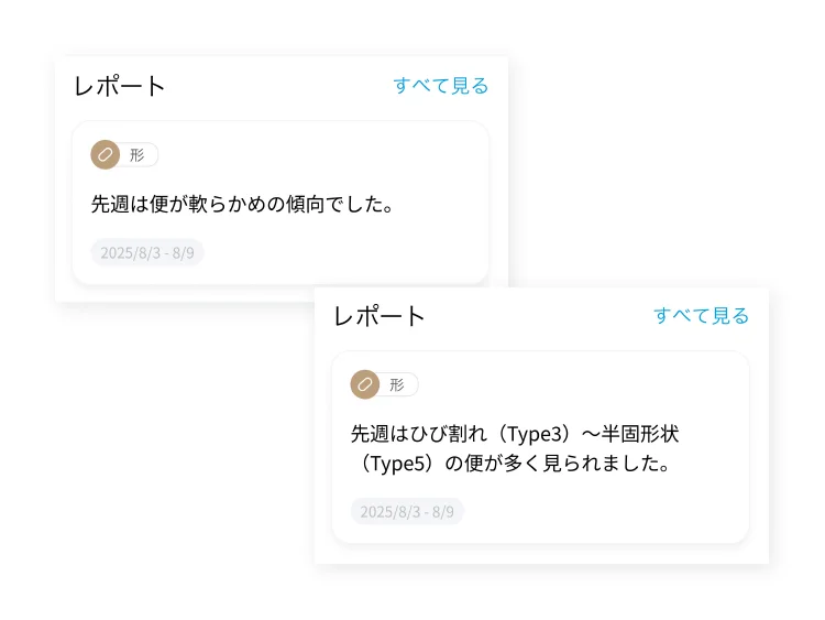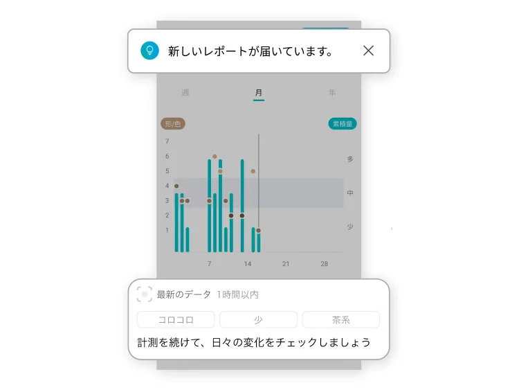 毎日の便の状態や傾向、その状態に合わせたリコメンドなどを表示します。
