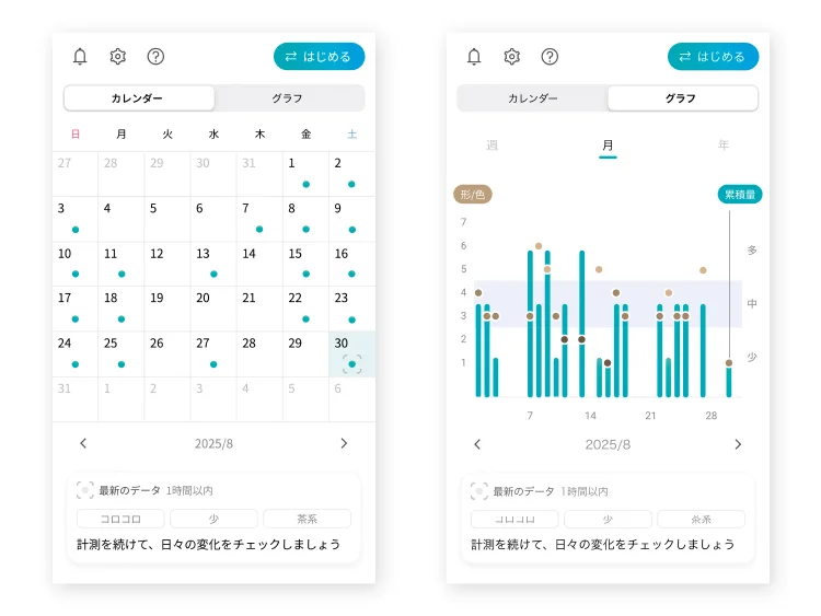 計測した日をカレンダーに表示します。月ごとの傾向はグラフで分かりやすく表示します。