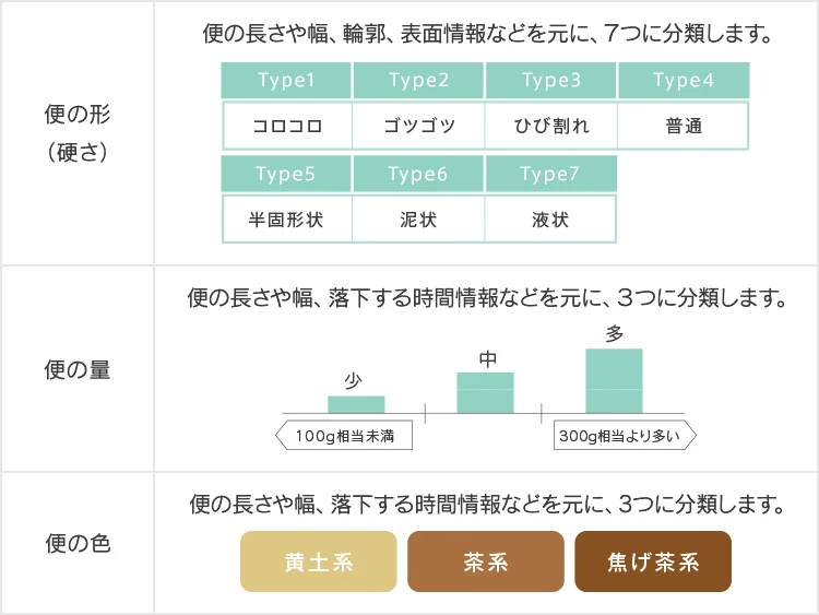便の長さや幅、輪郭、表面情報、落下する時間情報、便の明るさ等を元に3つのカテゴリに分け、それぞれ分類して判定。