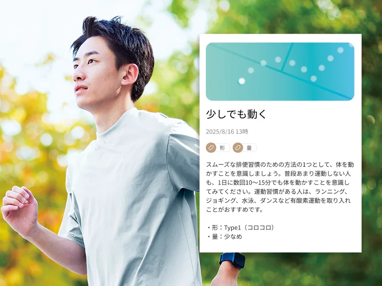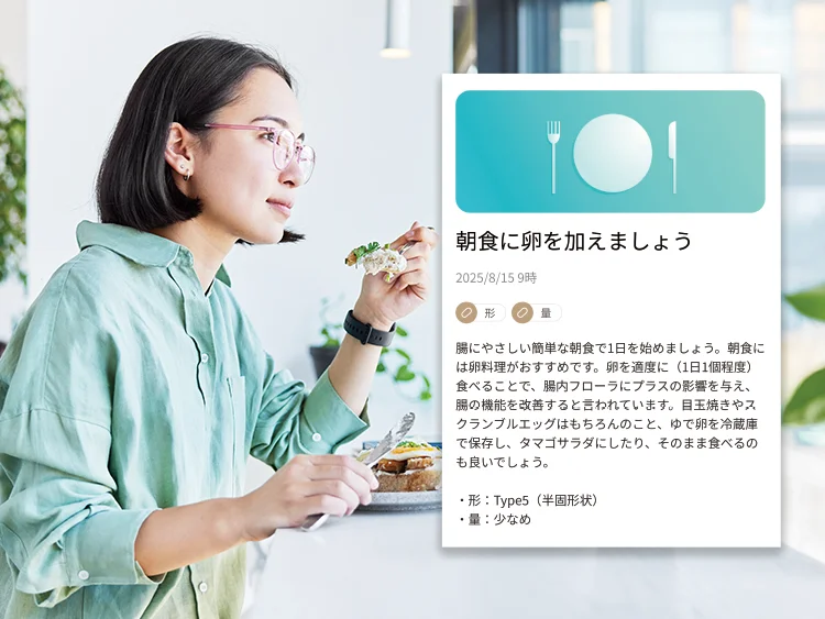 お腹にも、日々の生活にも負担をかけない食事メニューをリコメンド。 規則正しい穏やかな毎日は、トイレから始まる。
