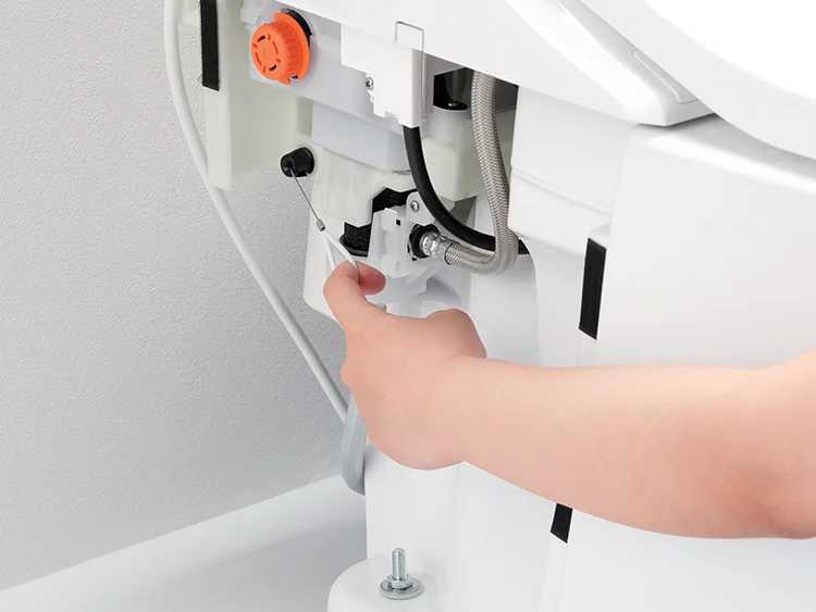 便器に向かって左奥(すっきりパネル内)の給水リング・水ためリングで操作できます。電池は使用しません。