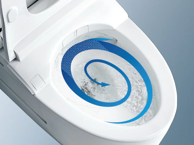 渦を巻くようなトルネード洗浄が、少ない水で効率的に洗浄します。汚物が付着しやすい便器後方に勢いよく水が当たるので、汚れをしっかり洗い流します。便器正面から吐水口が見えず、見た目もすっきりしています。